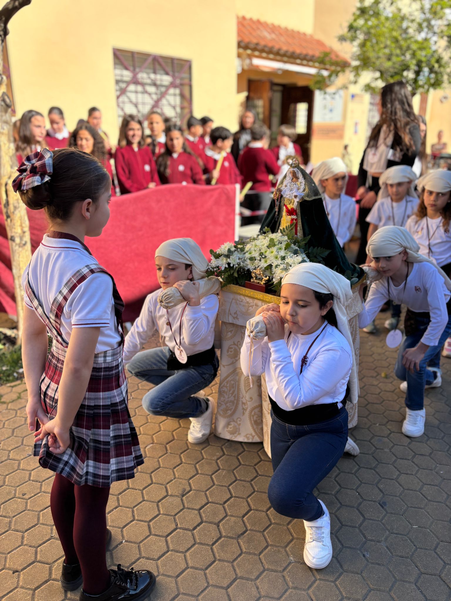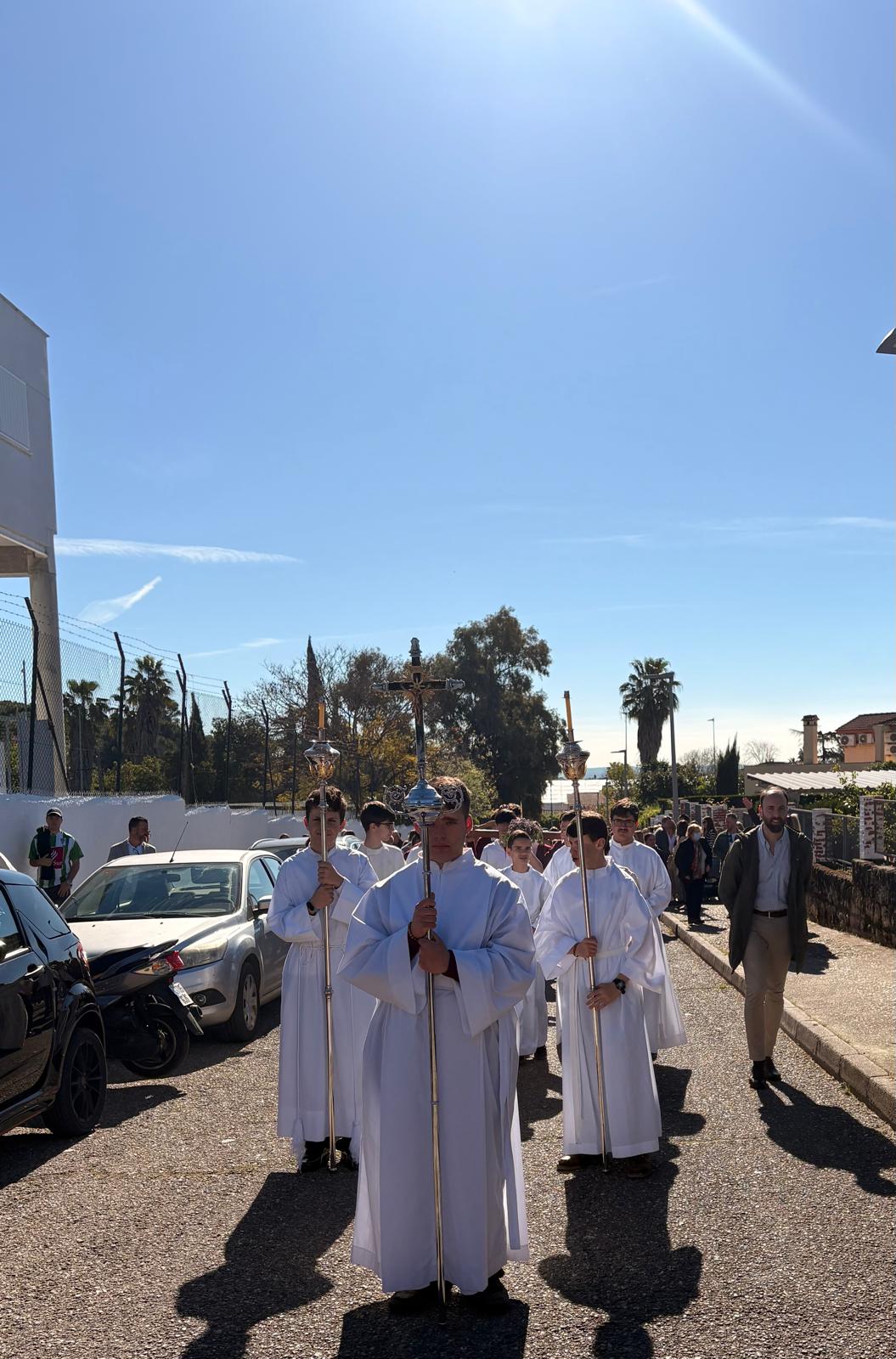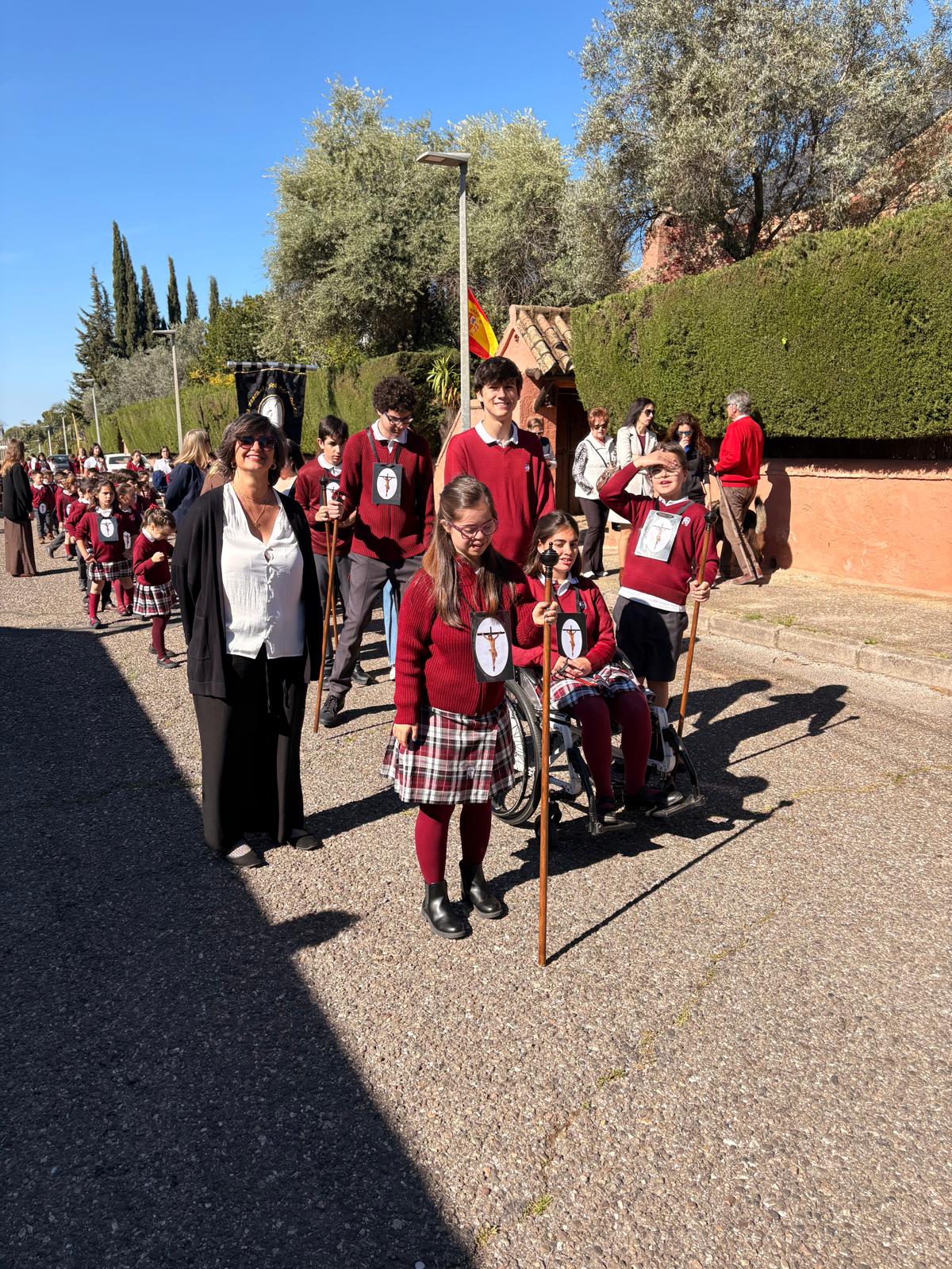 Mantillas y Monaguillos: Las alumnas, luciendo con elegancia el tradicional encaje, y los monaguillos, con sus cestos y ciriales, aportaron el color y la solemnidad necesarios.