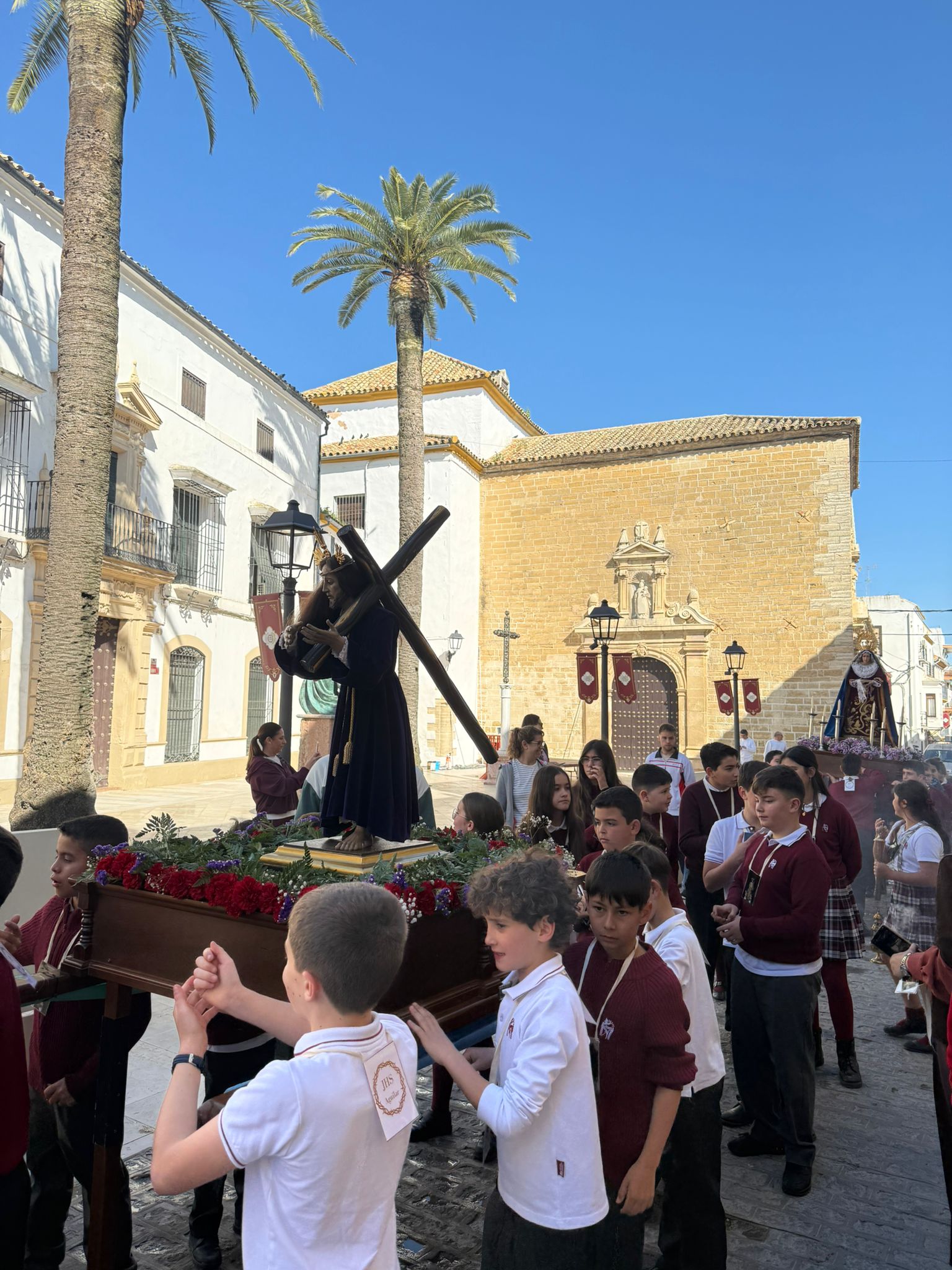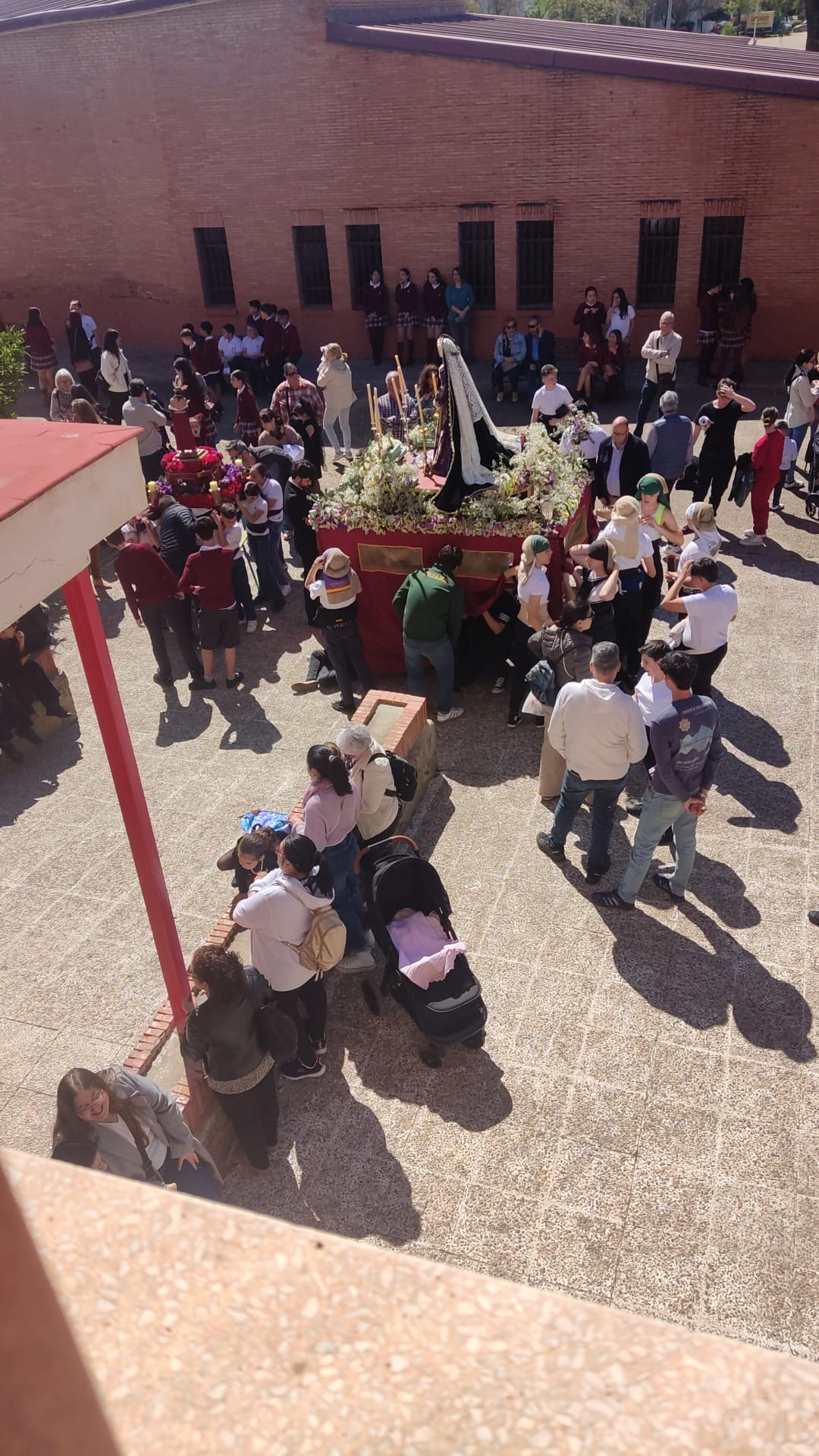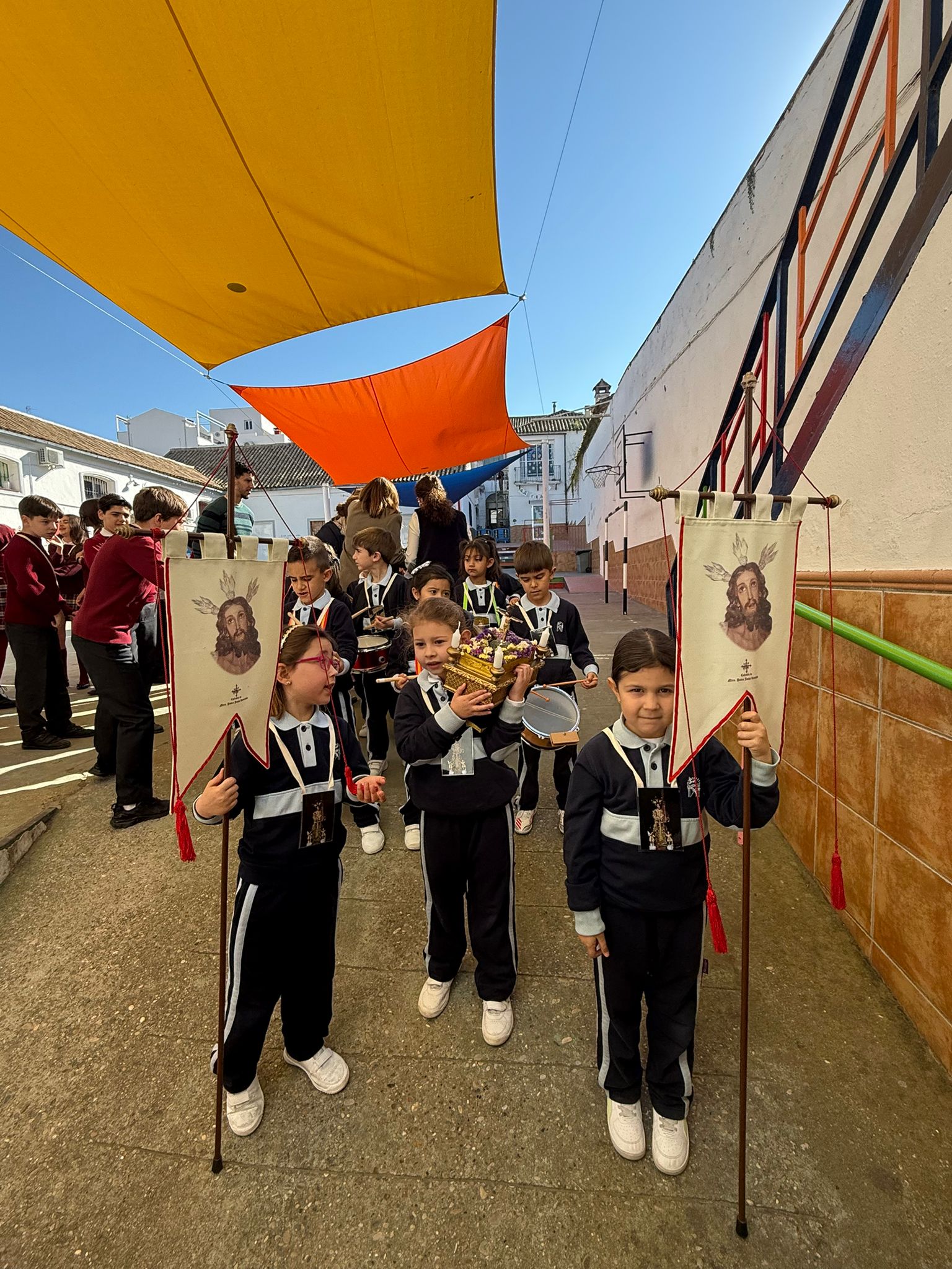 Lo que habitualmente son zonas de recreo y deporte se convirtieron por un día en auténticas Carreras Oficiales. Con un despliegue de organización envidiable, los patios fueron el escenario de estaciones de penitencia perfectamente coreografiadas, donde no faltó el respeto y el fervor que estas fechas requieren.