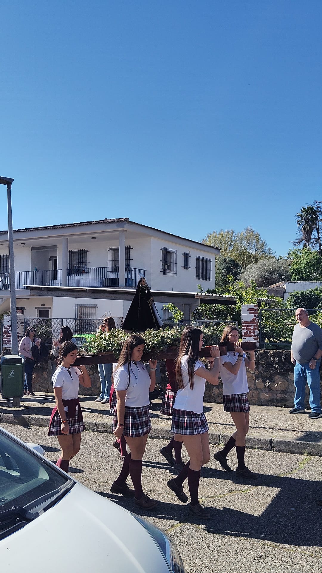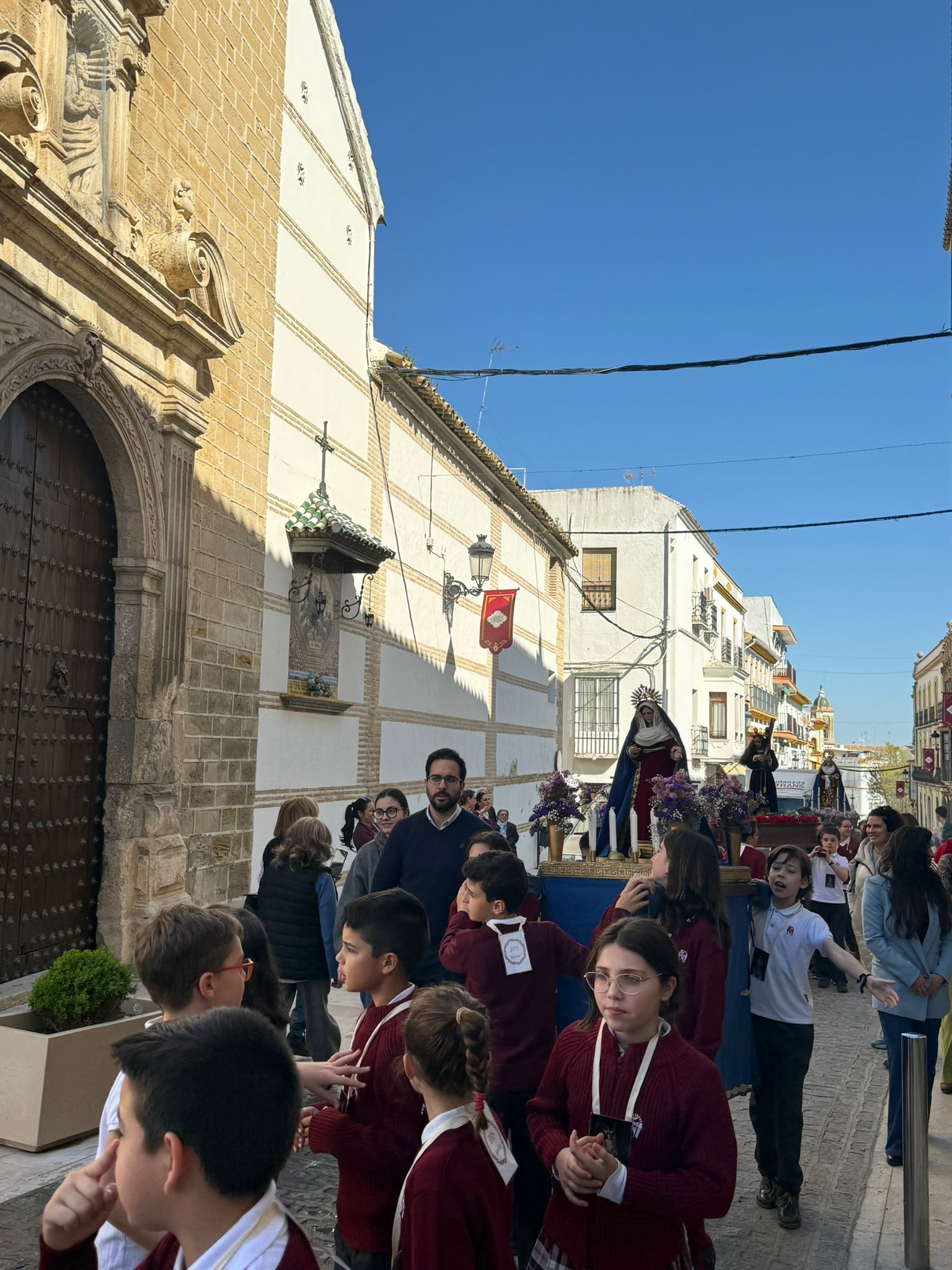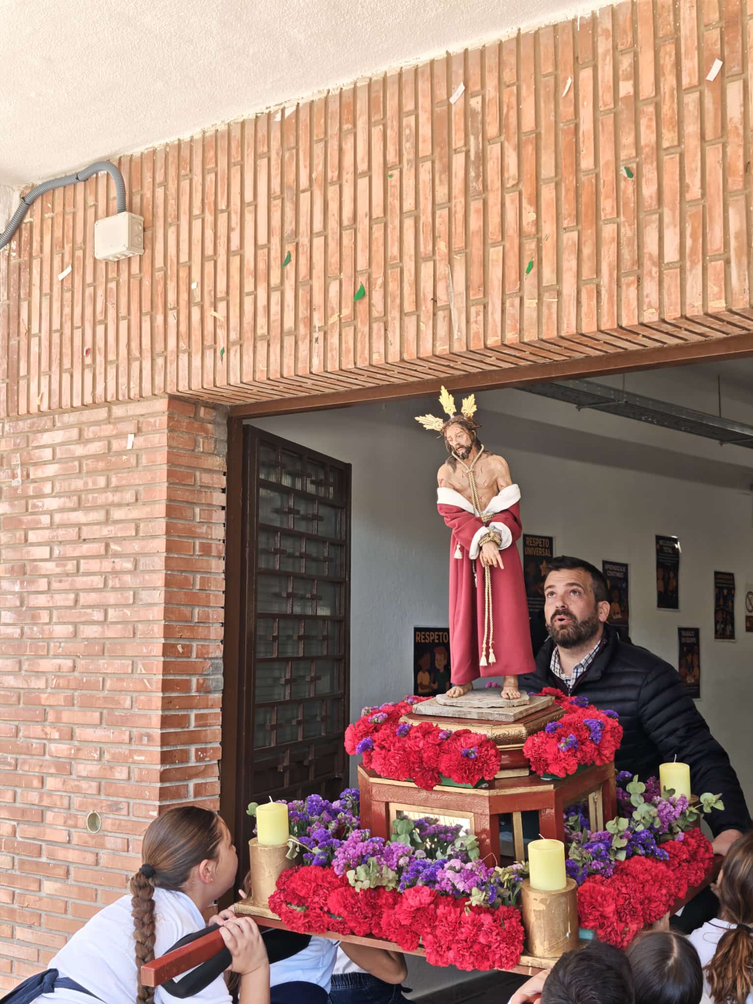 Lo que habitualmente son zonas de recreo y deporte se convirtieron por un día en auténticas Carreras Oficiales. Con un despliegue de organización envidiable, los patios fueron el escenario de estaciones de penitencia perfectamente coreografiadas, donde no faltó el respeto y el fervor que estas fechas requieren.